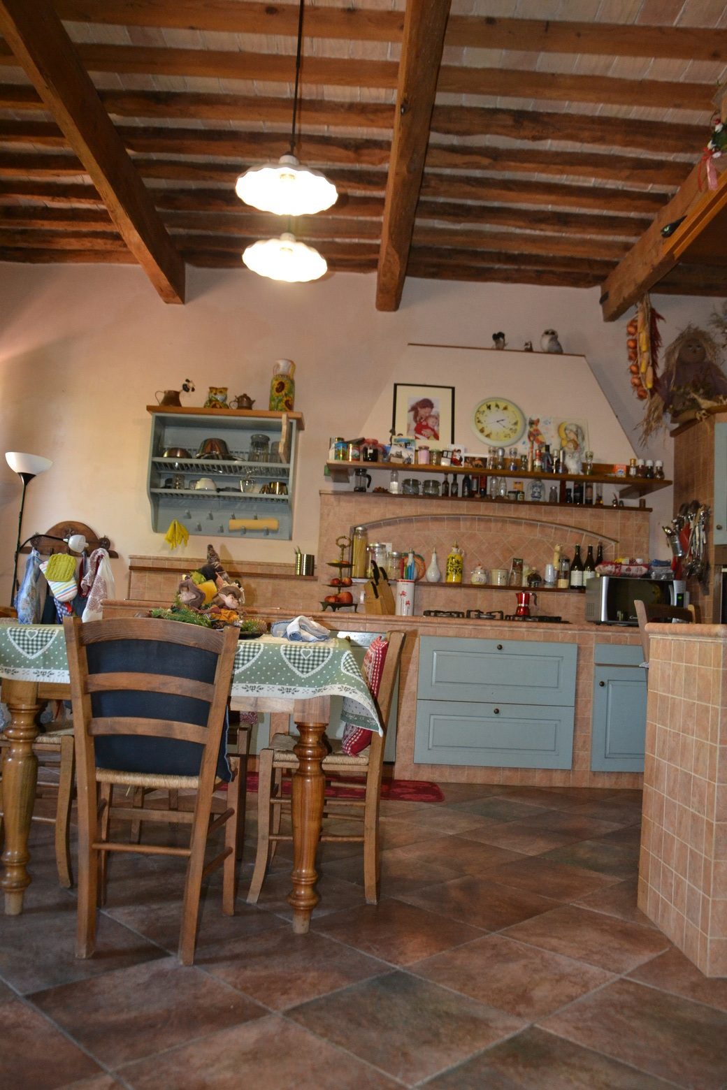 Al piano Terra sono presenti i seguenti ambienti: Ingresso, cucina abitabile in muratura con camino (che può anche scaldare gli altri ambienti), disimpegno, studio, lavanderia/ centrale termica, bagno, antibagno e un ampio salone ricavato dalla vecchia stalla. Misura: 187 Mq. Vi sono poi il garage di 38 Mq e una legnaia sul retro di 16 Mq.